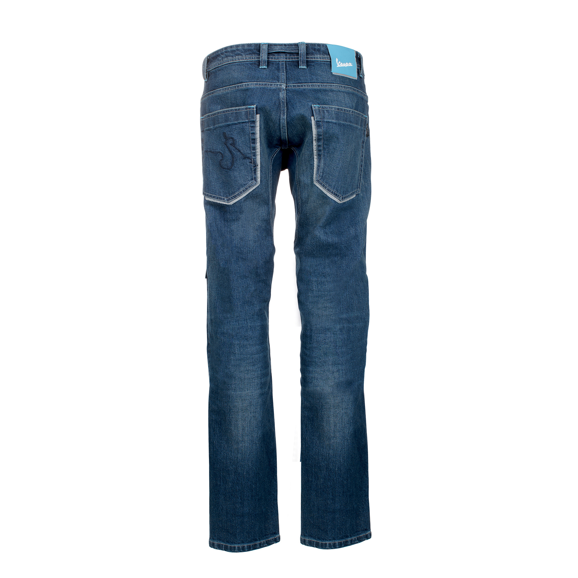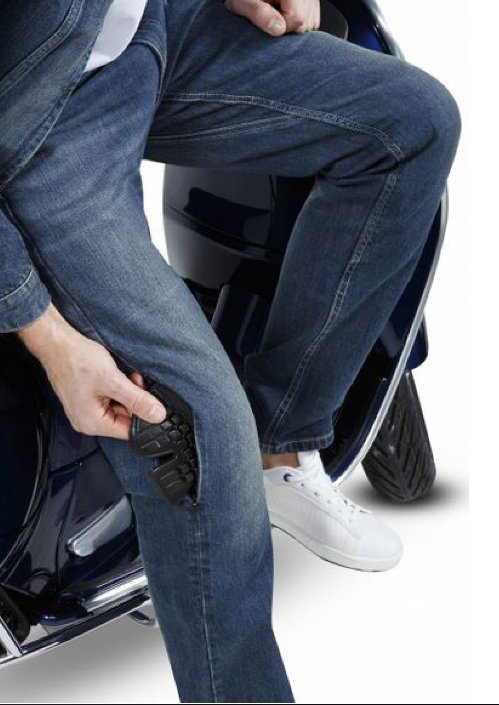 Made of abrasion resistant Cordura® / cotton blend fabric and stretch panels for maximum comfort. prEN17092 certified. Knee protectors certified according to EN 1621-1: 2012 incl. (access from the outside of the pants). "Lite Warrior" hip protectors (liv.1) sold separately. Profiled back pockets with reflective print. Vespa Shape seams on the back pocket (tone-on-tone) and reflective decorative print; Fit SLIM.