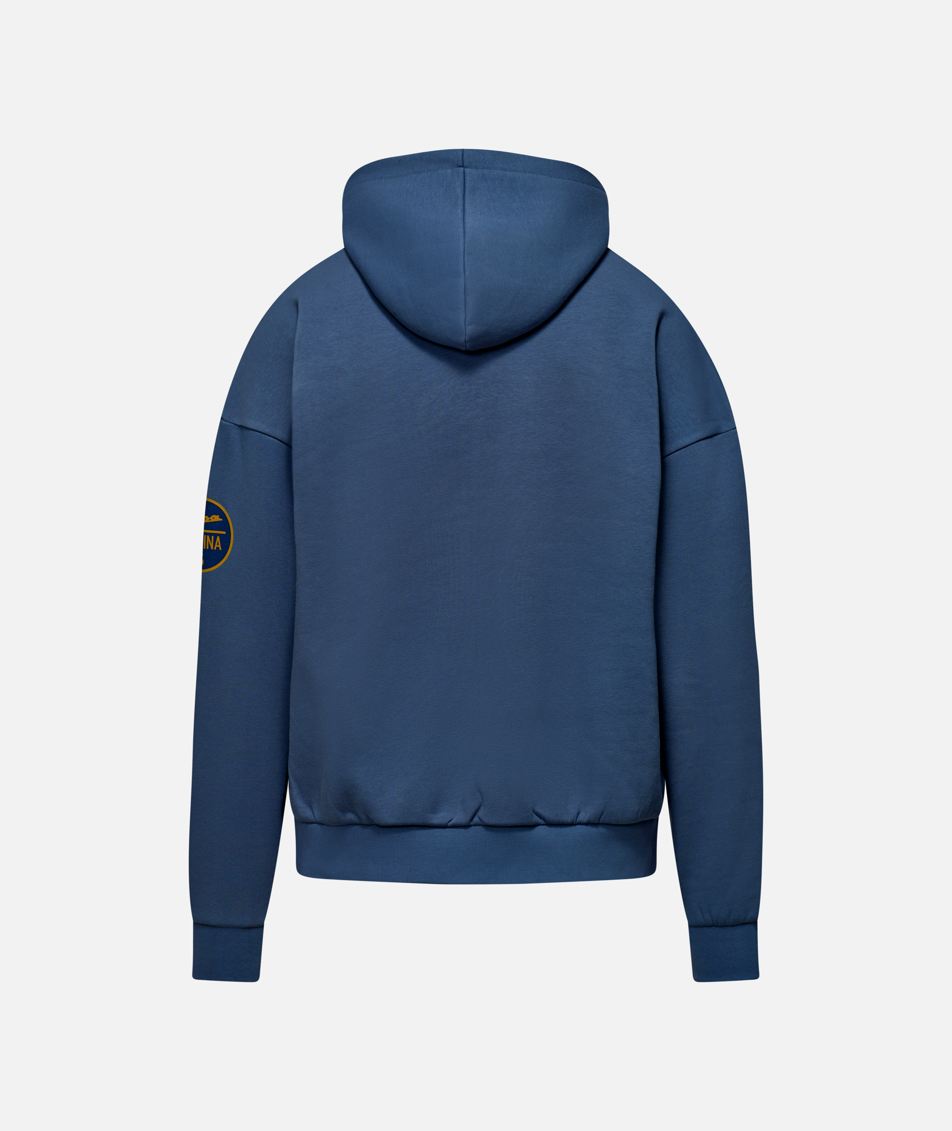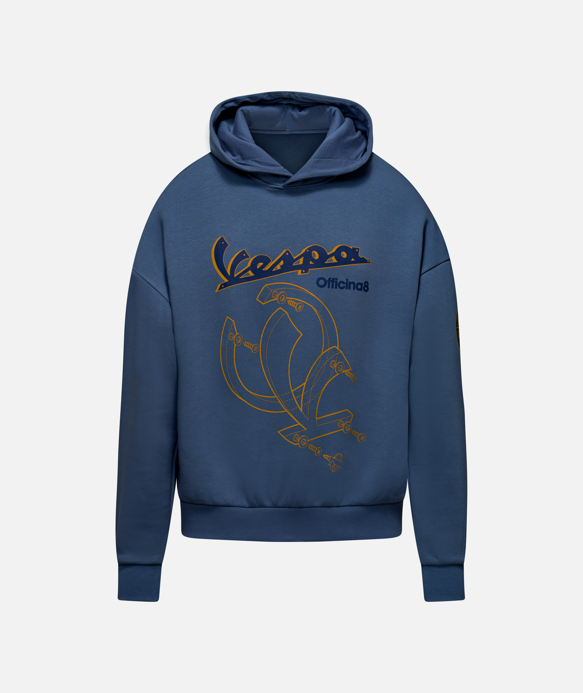 A comfortable and warm hoodie made from soft, brushed cotton fabric. It features the Vespa Officina 8 logo and new graphics on the front and sleeve, as well as an exclusive printed label on the inside.