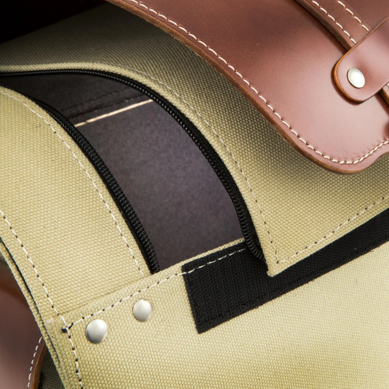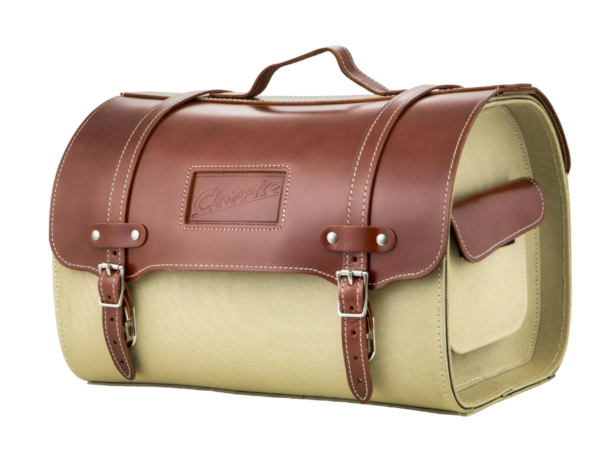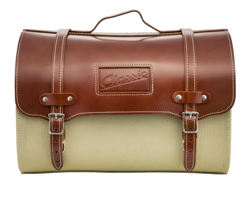 The case made of leather and canvas gives every Vespa a vintage look and is with its "Classic" lettering a special eye-catcher on every scooter. The large main compartment offers enough space to safely store the groceries from the supermarket, the weekly market shopping or the helmet.