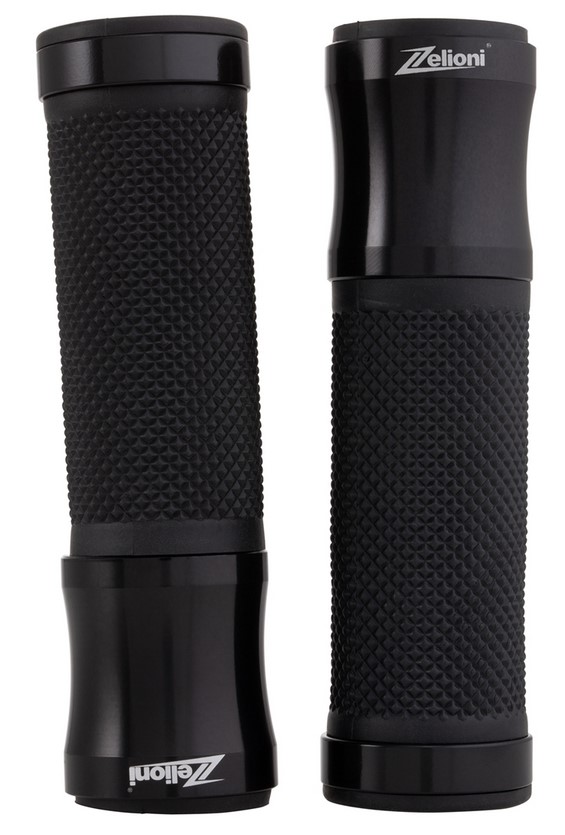 Ergonomic grip with rubberized palm. Aluminum caps with laser-engraved ZELIONI logo. Ends open for mounting bar end weights/mirrors.