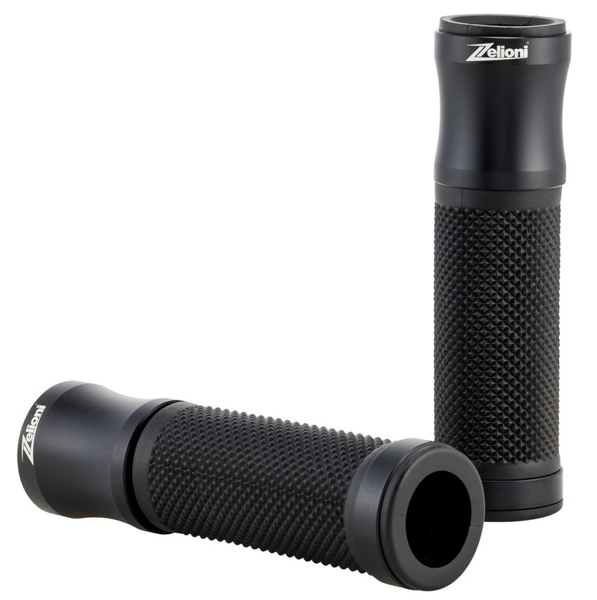 Ergonomic grip with rubberized palm. Aluminum caps with laser-engraved ZELIONI logo. Ends open for mounting bar end weights/mirrors.