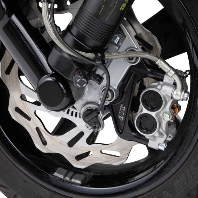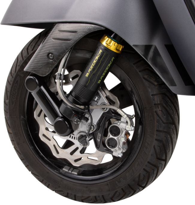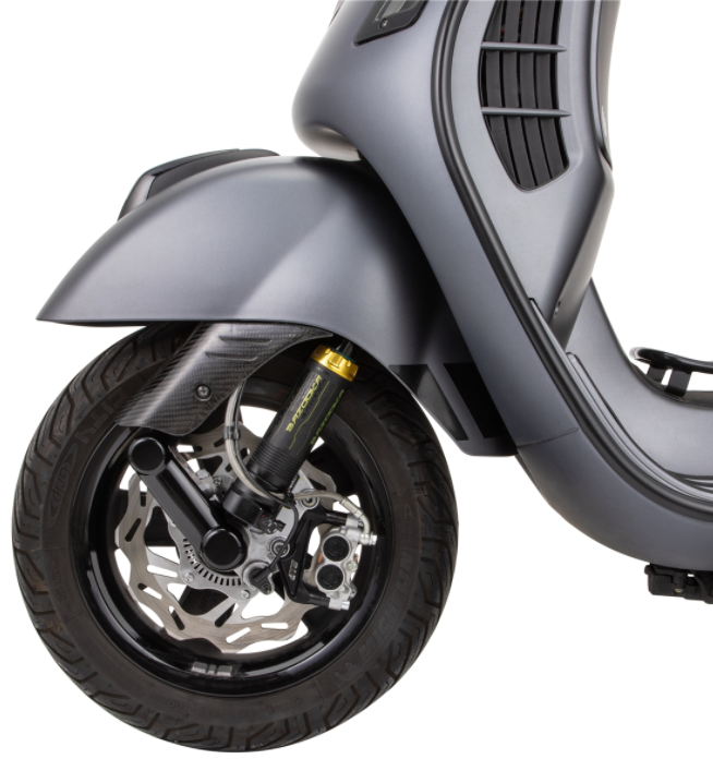 The brake kit SIP PERFORMANCE is completely ready to install and ideally suited to the conditions of the Modern Vespa. The CNC-milled "NEW ERA" 4-piston brake caliper from Ottopuntouno with an enlarged piston and pad surface is torsion-resistant and significantly lighter than the original. We supply the CNC-milled adapter made of aluminum to match. This is precisely manufactured and enables the assembly of the radial brake caliper, which means that the braking values of a modern sports motorcycle can be achieved. With the recording, the use of an oversize brake disc is possible, diameters of up to 260mm can be driven with the help of suitable spacers. A deepened bleeder screw is required for brake discs from 250mm so that the rim cannot touch the brake caliper. Since the brake caliper has an M8 mount for the brake line, we include an adapter hollow screw of Ø10mm brake line suitable for the radial brake caliper including sealing rings.