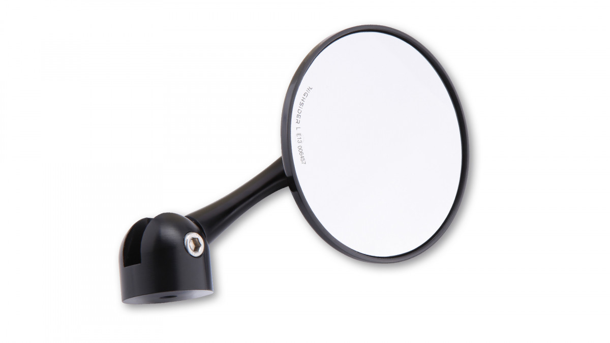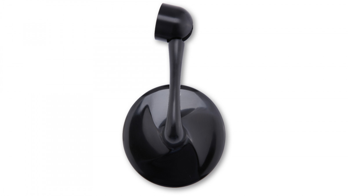 Classy, CNC-milled bar-end mirror with a round head made of high-quality aluminum, black anodized. The stylized propeller on the back of the mirror head underlines the unusual design of this model. Thanks to an innovative universal clamping system, the mirrors fit handlebars with an inner diameter of 12 to 22 mm. The handle is adjustable up and down for even better rear visibility and safety. Usable for right and left side.