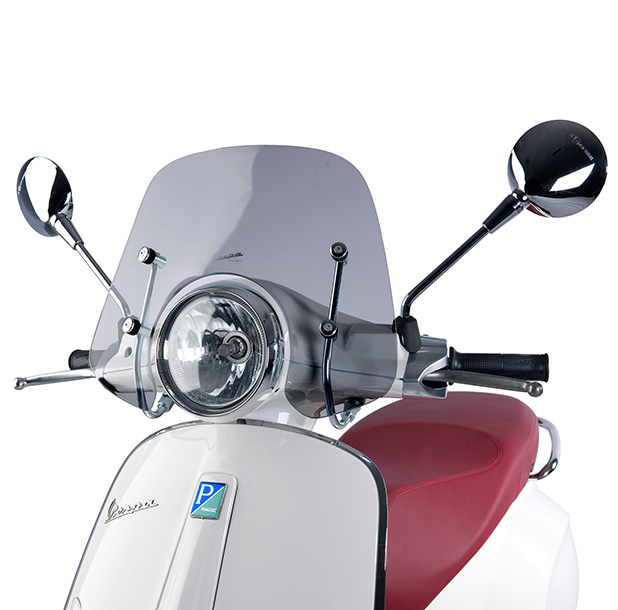 Original windshield Cruiser tinted for the Vespa Primavera / Elettrica. Fits on 50er and 125er, and comes in the tinted version much sportier. The windshield is made of shock and scratch resistant methacrylate and provided with "Vespa" lettering. The mounting is included.