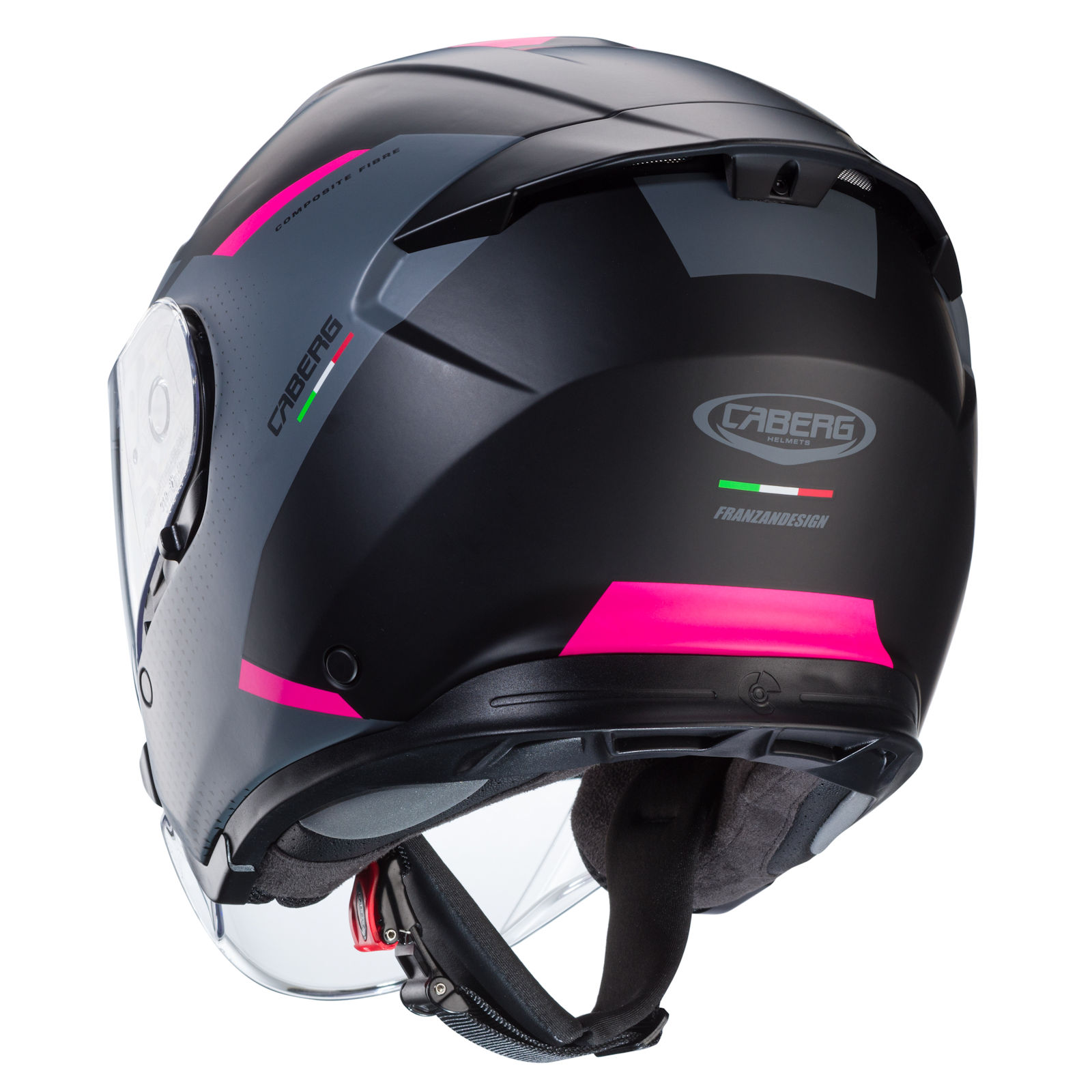 The Caberg Flyon II jet helmet with the Boss decor in matt black/grey fuchsia has the following features: