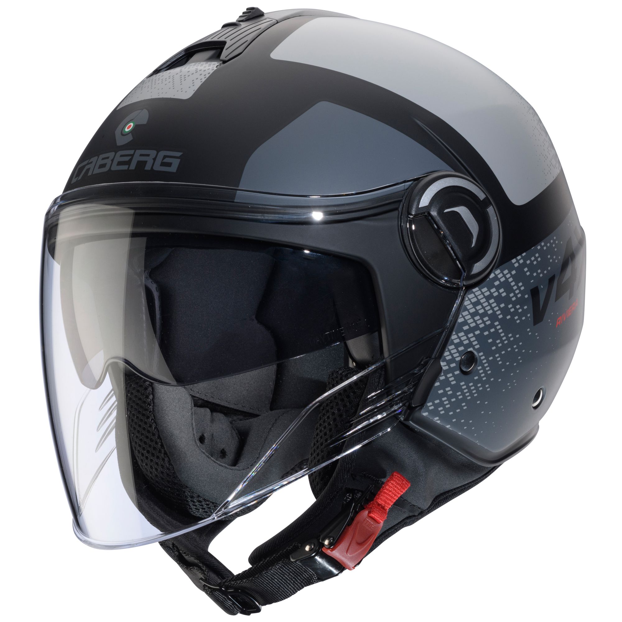 The Caberg Riviera V4 X jet helmet with the Alpha decor in the colors matt black/anthracite grey has the following features: